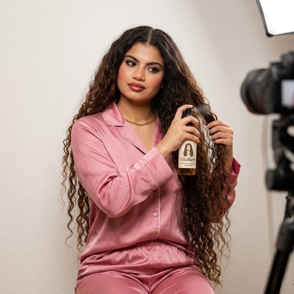 Produits capillaires Vitakely, crème, spray et huile pour cheveux bouclés, avec une femme aux cheveux bouclés portant du maquillage rouge à lèvres.